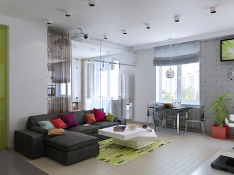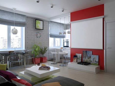 Овој апартман се наоѓа во центарот на Киев, а се протега на површина од 47m². Автор на дизајнот е Olga Kataevskaya, која употребила неколку прегради и добила функционална целина. Кујната е одделена од просторот за дневен боравок со параван на кој се наоѓа и платно за прожекторот, а спалната соба со стаклени прегради кои овозможуваат светлина, но и добар проток.
